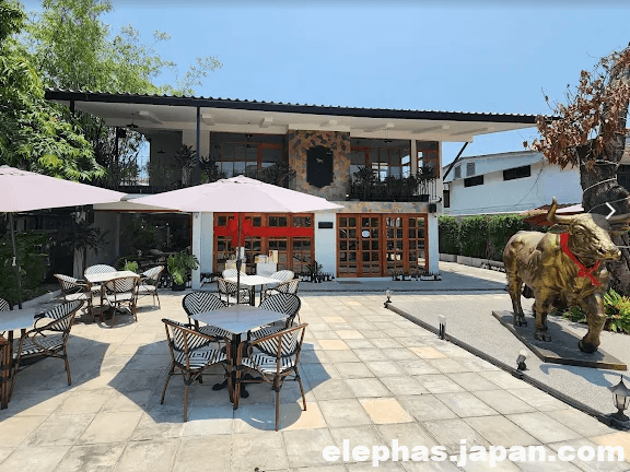 目印は、白を基調とした清潔感のある綺麗な建物と、入り口に鎮座する「黄金の巨大な牛のモニュメント」です。