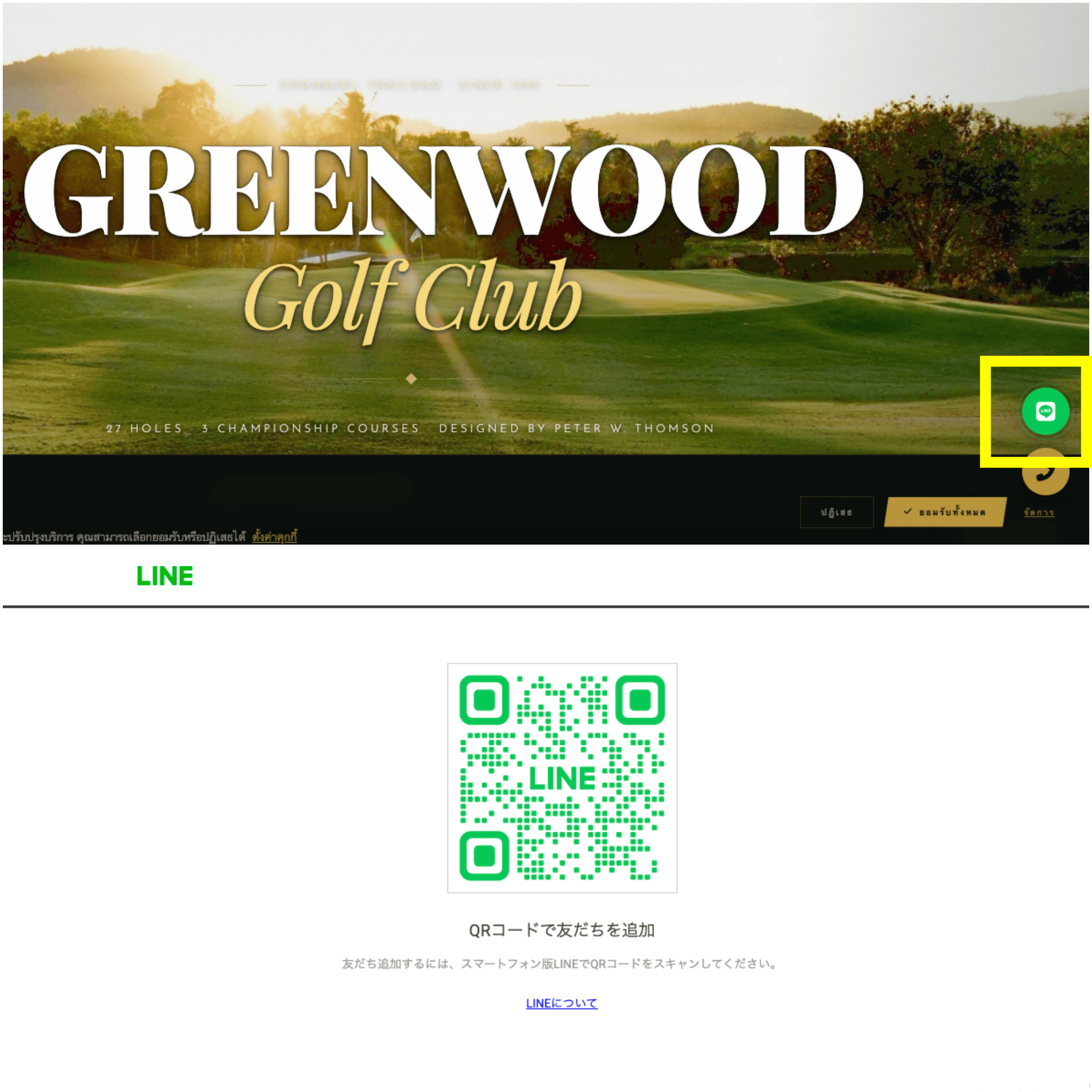 参考に、グリーウッドゴルフクラブの公式サイトだと、右下にLINEアイコンがある。ここをクリックすると友達追加のQRコードが出てくるので、これを読み込めば登録完了。